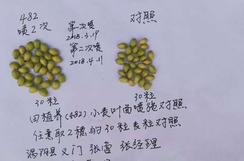 Multiple concentration gradient tests had shown that spraying Tian Zhi Yang 482 to the leaves of wheat for three periods can increase yield by about 50 kg per mu, and the input cost is only more than RMB 10.